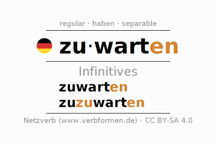 The conjugation of zuwarten in Infinitive Present Perfect base form Active is zuwarten, zuzuwarten.The conjugation corresponds to certain grammatical rules. Likewise the requirements for the conjugation of the simple verb forms of zuwarten in Infinitive. Comments ☆