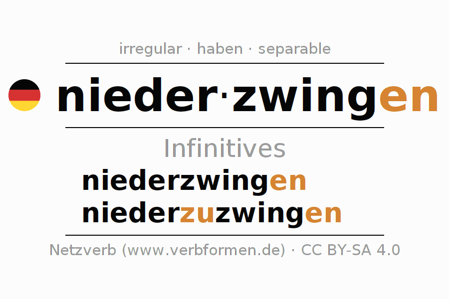 The infinitives of niederzwingen (subdue, defeat) are: niederzwingen, niederzuzwingen. The ending -en is appended to the verb stem zwing. When forming the infinitive with zu the "zu" is inserted after the separable first part nieder-. The formation of the forms corresponds to the grammatical rules for the conjugation of verbs in the infinitive. Comments ☆