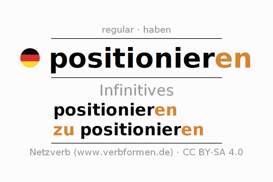 The infinitives of positionieren (position, assert) are: positionieren, zu positionieren. The ending -en is appended to the verb stem positionier. When forming the infinitive with zu, the "zu" is prepended to the verb, since it has no separable first parts. The formation of the forms corresponds to the grammatical rules for the conjugation of verbs in the infinitive. Comments ☆