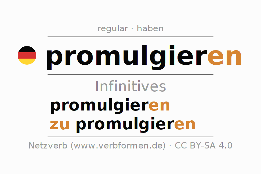 The verb promulgieren fully conjugated in all persons and numbers in the Infinitive Present Perfect