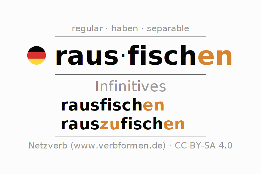 The infinitives of rausfischen (extract, fish out) are: rausfischen, rauszufischen. The ending -en is appended to the verb stem fisch. When forming the infinitive with zu the "zu" is inserted after the separable first part raus-. The formation of the forms corresponds to the grammatical rules for the conjugation of verbs in the infinitive. Comments ☆