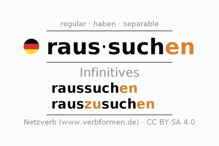 The infinitives of raussuchen (choose, pick out) are: raussuchen, rauszusuchen. The ending -en is appended to the verb stem such. When forming the infinitive with zu the "zu" is inserted after the separable first part raus-. The formation of the forms corresponds to the grammatical rules for the conjugation of verbs in the infinitive. Comments ☆