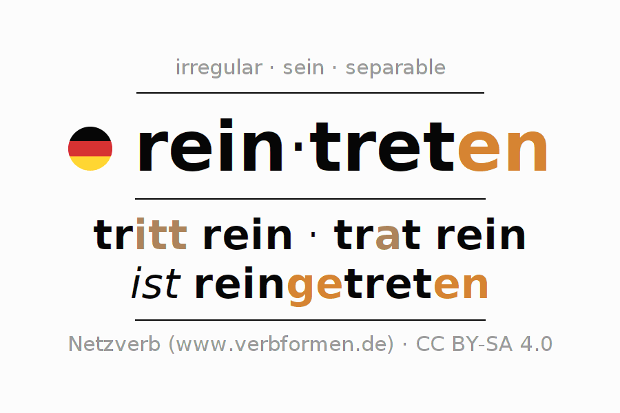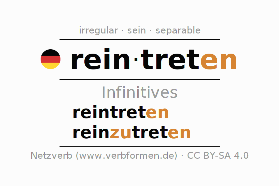 The infinitives of reintreten (enter, step in) are: reintreten, reinzutreten. The ending -en is appended to the verb stem tret. When forming the infinitive with zu the "zu" is inserted after the separable first part rein-. The formation of the forms corresponds to the grammatical rules for the conjugation of verbs in the infinitive. Comments ☆