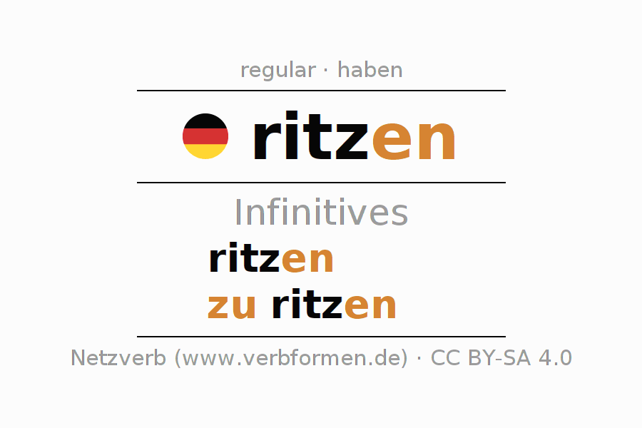 The infinitives of ritzen (scratch, carve) are: ritzen, zu ritzen. The ending -en is appended to the verb stem ritz. When forming the infinitive with zu, the "zu" is prepended to the verb, since it has no separable first parts. The formation of the forms corresponds to the grammatical rules for the conjugation of verbs in the infinitive. Comments ☆