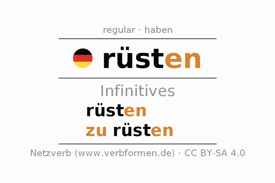 The infinitives of rüsten (prepare, arm) are: rüsten, zu rüsten. The ending -en is appended to the verb stem rüst. When forming the infinitive with zu, the "zu" is prepended to the verb, since it has no separable first parts. The formation of the forms corresponds to the grammatical rules for the conjugation of verbs in the infinitive. Comments ☆