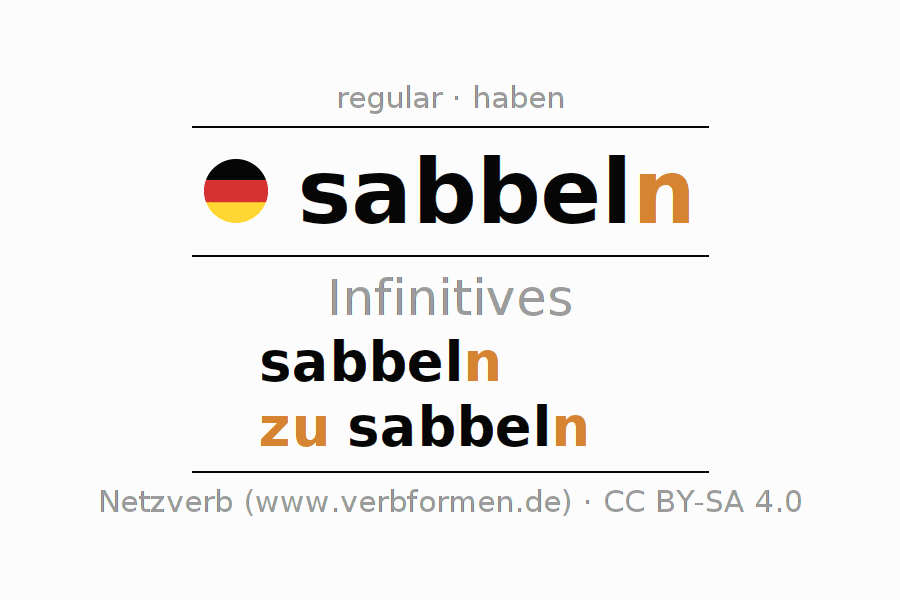The infinitives of sabbeln (slobber, babble) are: sabbeln, zu sabbeln. The ending -n, shortened by an "e", is appended to the verb stem sabbel, since the stem ends with -el. When forming the infinitive with zu, the "zu" is prepended to the verb, since it has no separable first parts. The formation of the forms corresponds to the grammatical rules for the conjugation of verbs in the infinitive. Comments ☆