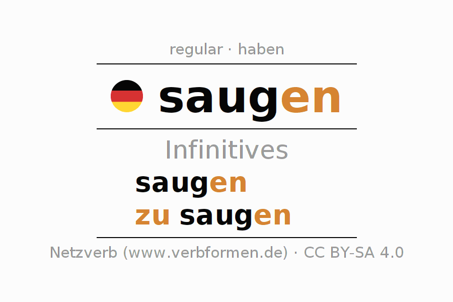 The infinitives of saugen (suck, vacuum) are: saugen, zu saugen. The ending -en is appended to the verb stem saug. When forming the infinitive with zu, the "zu" is prepended to the verb, since it has no separable first parts. The formation of the forms corresponds to the grammatical rules for the conjugation of verbs in the infinitive. Comments ☆