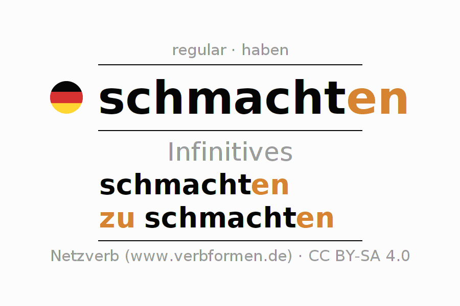 The infinitives of schmachten (crave, languish) are: schmachten, zu schmachten. The ending -en is appended to the verb stem schmacht. When forming the infinitive with zu, the "zu" is prepended to the verb, since it has no separable first parts. The formation of the forms corresponds to the grammatical rules for the conjugation of verbs in the infinitive. Comments ☆