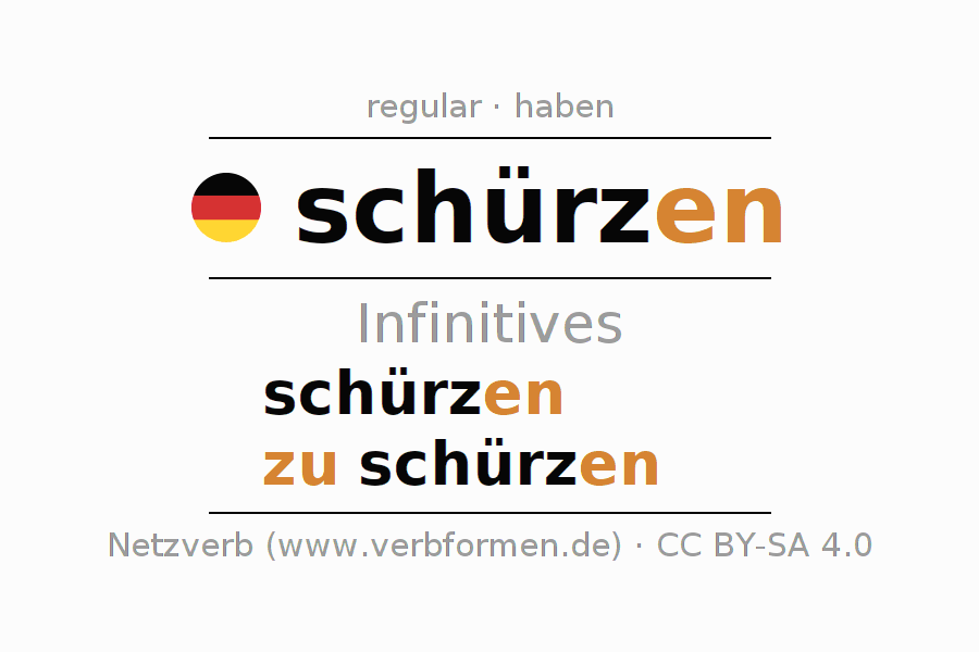 The infinitives of schürzen (tie, gather up) are: schürzen, zu schürzen. The ending -en is appended to the verb stem schürz. When forming the infinitive with zu, the "zu" is prepended to the verb, since it has no separable first parts. The formation of the forms corresponds to the grammatical rules for the conjugation of verbs in the infinitive. Comments ☆