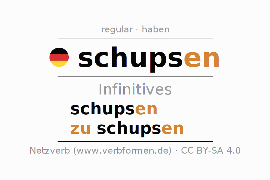 The infinitives of schupsen (nudge, push) are: schupsen, zu schupsen. The ending -en is appended to the verb stem schups. When forming the infinitive with zu, the "zu" is prepended to the verb, since it has no separable first parts. The formation of the forms corresponds to the grammatical rules for the conjugation of verbs in the infinitive. Comments ☆
