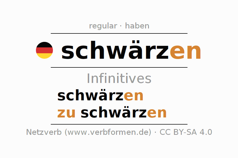The infinitives of schwärzen (blacken, black) are: schwärzen, zu schwärzen. The ending -en is appended to the verb stem schwärz. When forming the infinitive with zu, the "zu" is prepended to the verb, since it has no separable first parts. The formation of the forms corresponds to the grammatical rules for the conjugation of verbs in the infinitive. Comments ☆