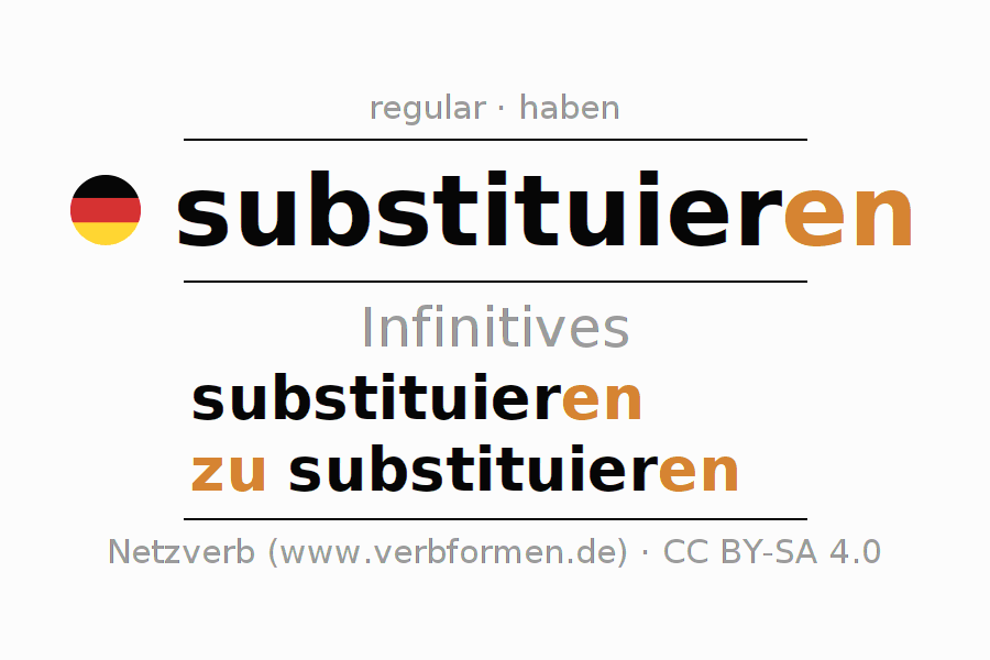 The infinitives of substituieren (substitute, exchange) are: substituieren, zu substituieren. The ending -en is appended to the verb stem substituier. When forming the infinitive with zu, the "zu" is prepended to the verb, since it has no separable first parts. The formation of the forms corresponds to the grammatical rules for the conjugation of verbs in the infinitive. Comments ☆