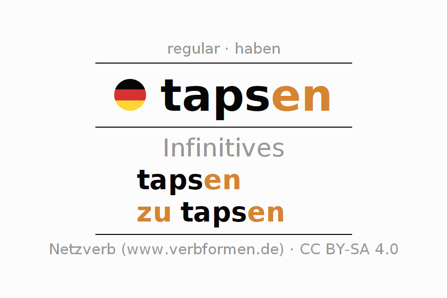 The infinitives of tapsen (fumble, shuffle) are: tapsen, zu tapsen. The ending -en is appended to the verb stem taps. When forming the infinitive with zu, the "zu" is prepended to the verb, since it has no separable first parts. The formation of the forms corresponds to the grammatical rules for the conjugation of verbs in the infinitive. Comments ☆