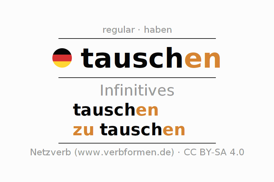 The infinitives of tauschen (exchange, swap) are: tauschen, zu tauschen. The ending -en is appended to the verb stem tausch. When forming the infinitive with zu, the "zu" is prepended to the verb, since it has no separable first parts. The formation of the forms corresponds to the grammatical rules for the conjugation of verbs in the infinitive. Comments ☆