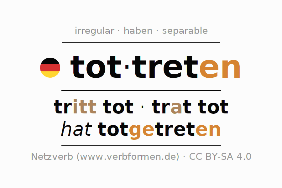 The infinitives of tottreten (kick to death, stamp to death) are: tottreten, totzutreten. The ending -en is appended to the verb stem tret. When forming the infinitive with zu the "zu" is inserted after the separable first part tot-. The formation of the forms corresponds to the grammatical rules for the conjugation of verbs in the infinitive. Comments ☆