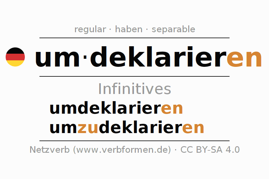 The infinitives of umdeklarieren (redeclare, redefine) are: umdeklarieren, umzudeklarieren. The ending -en is appended to the verb stem deklarier. When forming the infinitive with zu the "zu" is inserted after the separable first part um-. The formation of the forms corresponds to the grammatical rules for the conjugation of verbs in the infinitive. Comments ☆