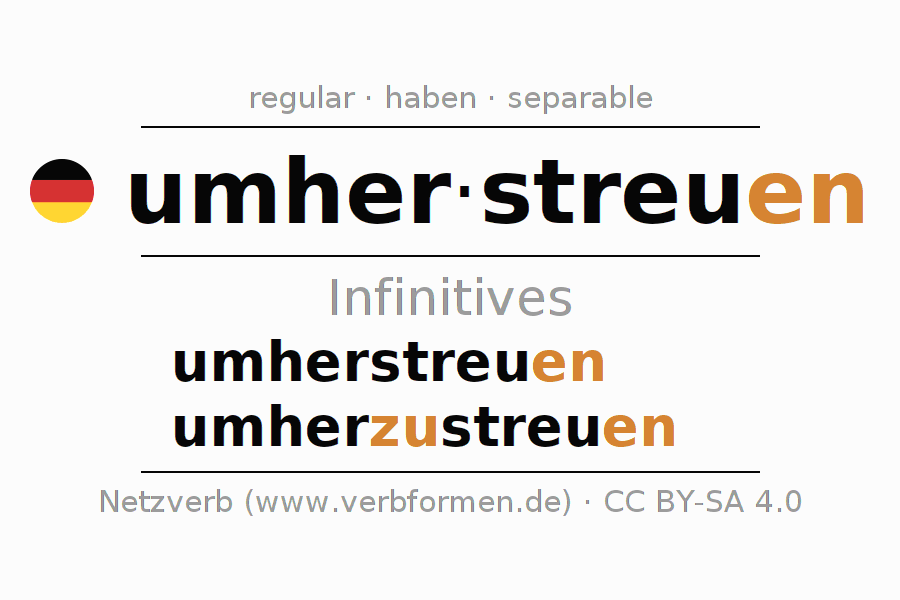 The infinitives of umherstreuen (scatter, spread around) are: umherstreu(e)n, umherzustreu(e)n. The ending -en is appended to the verb stem streu. When forming the infinitive with zu the "zu" is inserted after the separable first part umher-. The formation of the forms corresponds to the grammatical rules for the conjugation of verbs in the infinitive. Comments ☆