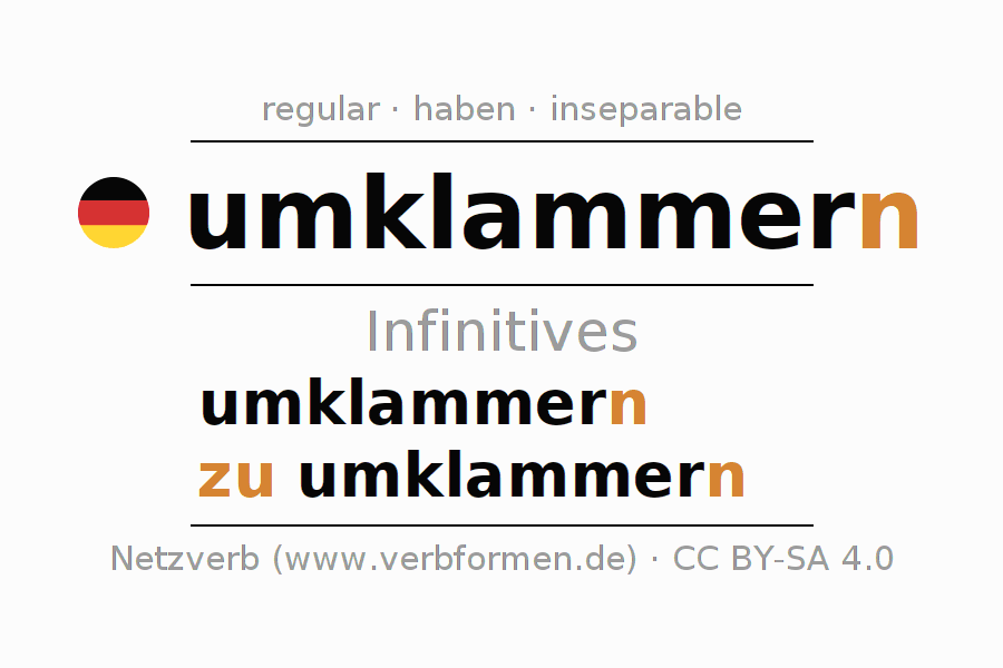 The infinitives of umklammern (clutch, embrace) are: umklammern, zu umklammern. The ending -n, shortened by an "e", is appended to the verb stem klammer, since the stem ends with -er. When forming the infinitive with zu, the "zu" is prepended to the verb, since it has no separable first parts. The formation of the forms corresponds to the grammatical rules for the conjugation of verbs in the infinitive. Comments ☆