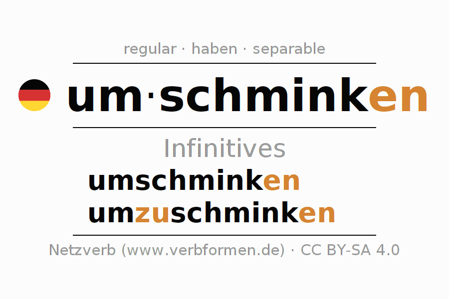 The infinitives of umschminken (reapply makeup, touch up) are: umschminken, umzuschminken. The ending -en is appended to the verb stem schmink. When forming the infinitive with zu the "zu" is inserted after the separable first part um-. The formation of the forms corresponds to the grammatical rules for the conjugation of verbs in the infinitive. Comments ☆