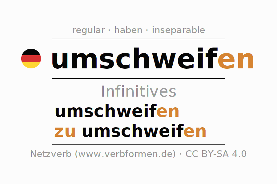The infinitives of umschweifen (wander, meander) are: umschweifen, zu umschweifen. The ending -en is appended to the verb stem schweif. When forming the infinitive with zu, the "zu" is prepended to the verb, since it has no separable first parts. The formation of the forms corresponds to the grammatical rules for the conjugation of verbs in the infinitive. Comments ☆