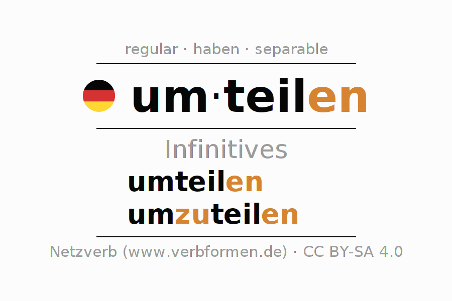 The infinitives of umteilen (reallocate, reassign) are: umteilen, umzuteilen. The ending -en is appended to the verb stem teil. When forming the infinitive with zu the "zu" is inserted after the separable first part um-. The formation of the forms corresponds to the grammatical rules for the conjugation of verbs in the infinitive. Comments ☆