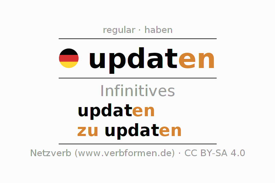 The infinitives of updaten (update) are: updaten, zu updaten. The ending -en is appended to the verb stem updat. When forming the infinitive with zu, the "zu" is prepended to the verb, since it has no separable first parts. The formation of the forms corresponds to the grammatical rules for the conjugation of verbs in the infinitive. Comments ☆