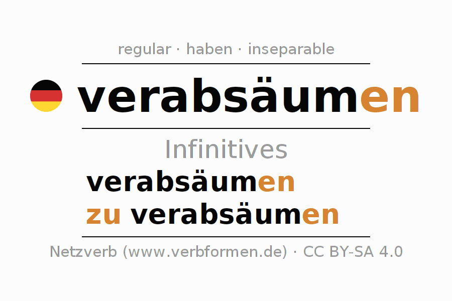 The infinitives of verabsäumen (miss, neglect) are: verabsäumen, zu verabsäumen. The ending -en is appended to the verb stem säum. When forming the infinitive with zu, the "zu" is prepended to the verb, since it has no separable first parts. The formation of the forms corresponds to the grammatical rules for the conjugation of verbs in the infinitive. Comments ☆