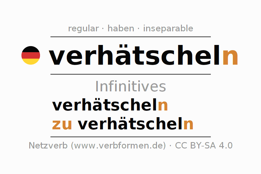 The infinitives of verhätscheln (pamper, coddle) are: verhätscheln, zu verhätscheln. The ending -n, shortened by an "e", is appended to the verb stem hätschel, since the stem ends with -el. When forming the infinitive with zu, the "zu" is prepended to the verb, since it has no separable first parts. The formation of the forms corresponds to the grammatical rules for the conjugation of verbs in the infinitive. Comments ☆