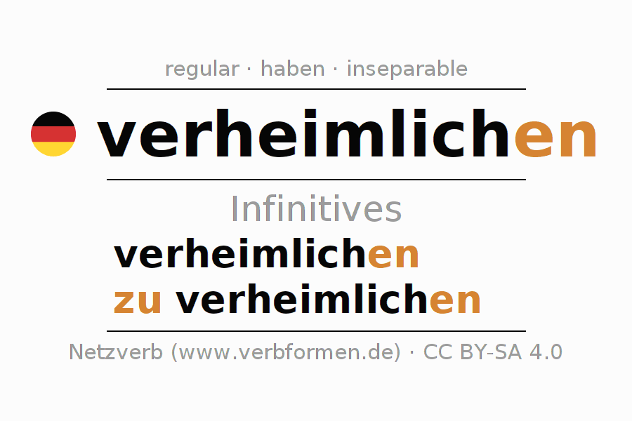 The infinitives of verheimlichen (hide, keep secret) are: verheimlichen, zu verheimlichen. The ending -en is appended to the verb stem heimlich. When forming the infinitive with zu, the "zu" is prepended to the verb, since it has no separable first parts. The formation of the forms corresponds to the grammatical rules for the conjugation of verbs in the infinitive. Comments ☆