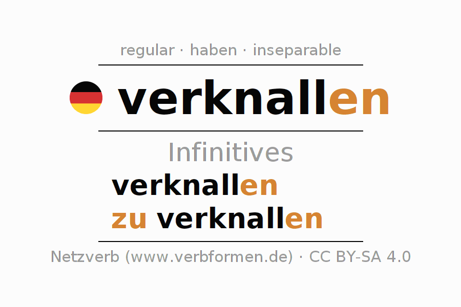 The infinitives of verknallen (fall in love, become infatuated with) are: verknallen, zu verknallen. The ending -en is appended to the verb stem knall. When forming the infinitive with zu, the "zu" is prepended to the verb, since it has no separable first parts. The formation of the forms corresponds to the grammatical rules for the conjugation of verbs in the infinitive. Comments ☆