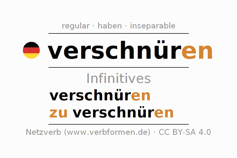 The infinitives of verschnüren (bind, cord) are: verschnüren, zu verschnüren. The ending -en is appended to the verb stem schnür. When forming the infinitive with zu, the "zu" is prepended to the verb, since it has no separable first parts. The formation of the forms corresponds to the grammatical rules for the conjugation of verbs in the infinitive. Comments ☆