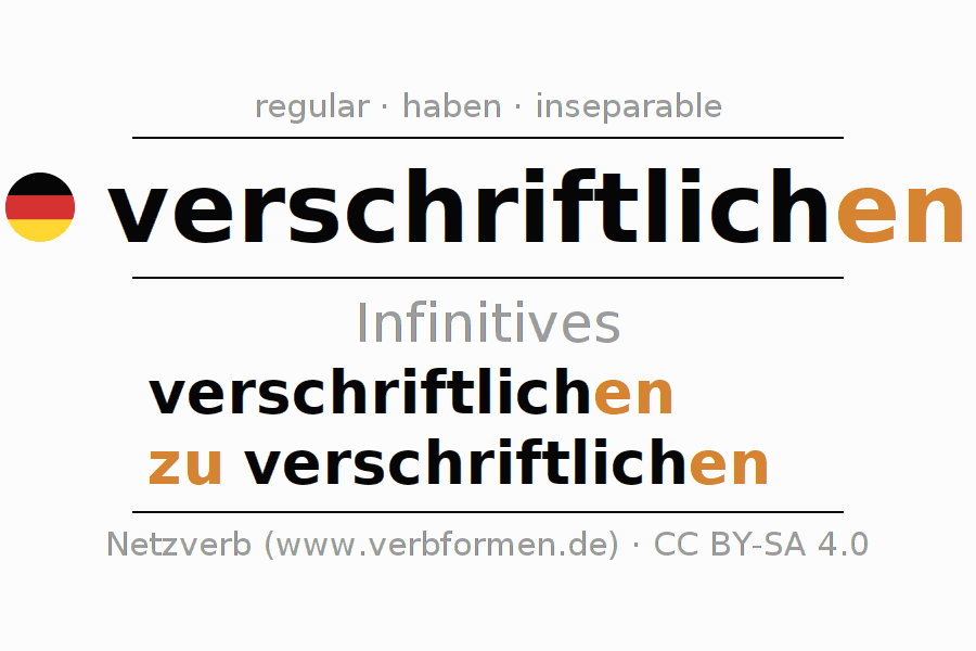 The infinitives of verschriftlichen (transcribe, write down) are: verschriftlichen, zu verschriftlichen. The ending -en is appended to the verb stem schriftlich. When forming the infinitive with zu, the "zu" is prepended to the verb, since it has no separable first parts. The formation of the forms corresponds to the grammatical rules for the conjugation of verbs in the infinitive. Comments ☆