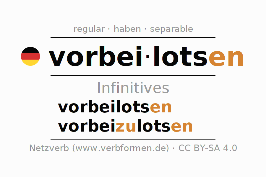 The verb vorbeilotsen fully conjugated in all persons and numbers in the Infinitive Present Perfect