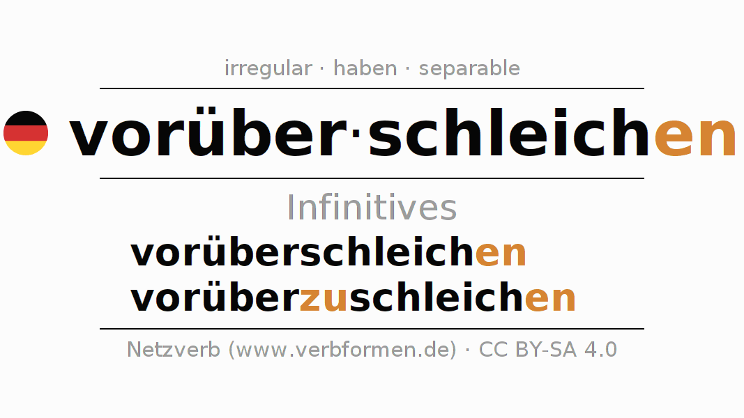 The infinitives of vorüberschleichen (creep past, sneak by) are: vorüberschleichen, vorüberzuschleichen. The ending -en is appended to the verb stem schleich. When forming the infinitive with zu the "zu" is inserted after the separable first part vorüber-. The formation of the forms corresponds to the grammatical rules for the conjugation of verbs in the infinitive. Comments ☆