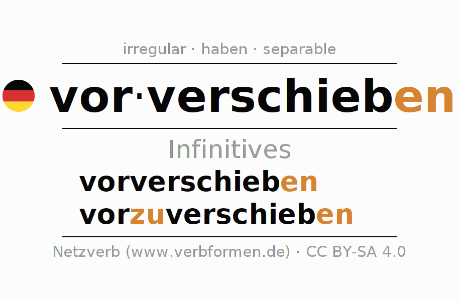 The infinitives of vorverschieben (advance, bring forward) are: vorverschieben, vorzuverschieben. The ending -en is appended to the verb stem schieb. When forming the infinitive with zu the "zu" is inserted after the separable first part vor-. The formation of the forms corresponds to the grammatical rules for the conjugation of verbs in the infinitive. Comments ☆