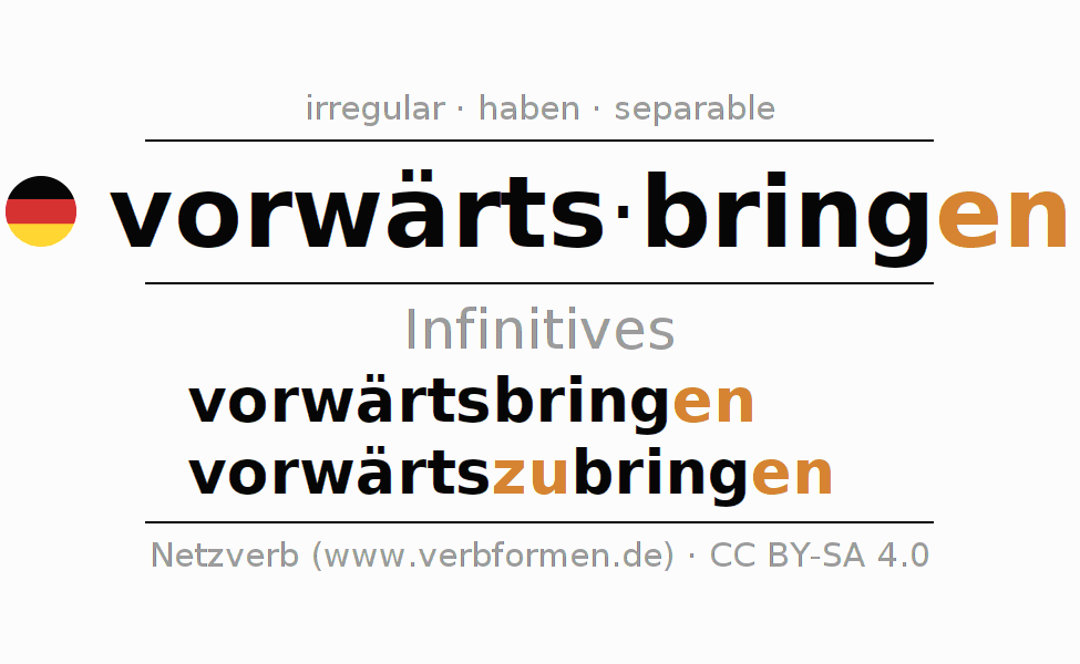 The infinitives of vorwärtsbringen (advance, bring forward) are: vorwärtsbringen, vorwärtszubringen. The ending -en is appended to the verb stem bring. When forming the infinitive with zu the "zu" is inserted after the separable first part vorwärts-. The formation of the forms corresponds to the grammatical rules for the conjugation of verbs in the infinitive. Comments ☆