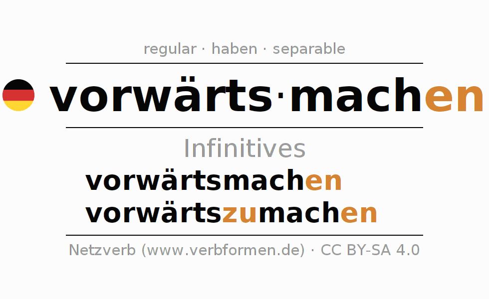 The verb vorwärtsmachen fully conjugated in all persons and numbers in the Infinitive Present Perfect
