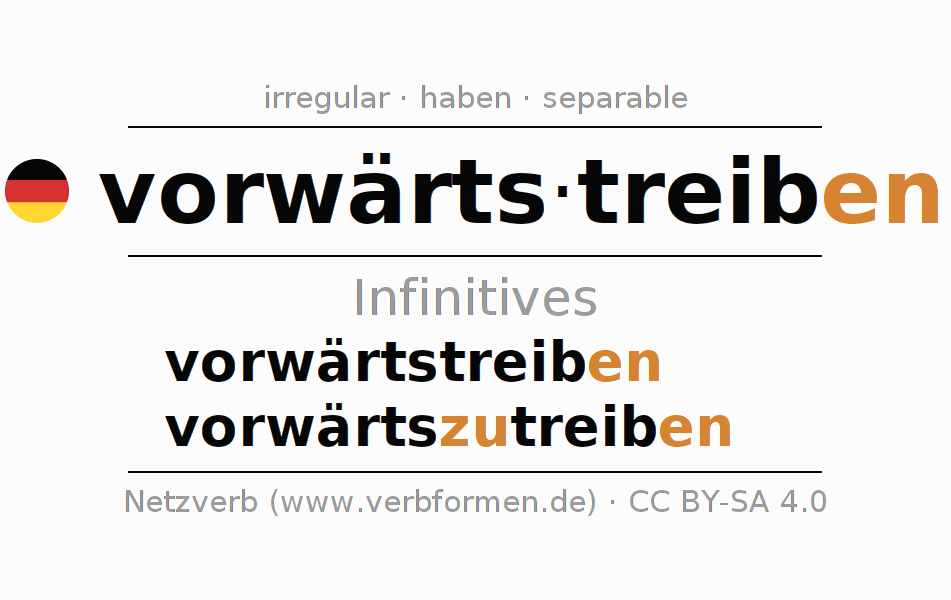 The infinitives of vorwärtstreiben (advance, drive forward) are: vorwärtstreiben, vorwärtszutreiben. The ending -en is appended to the verb stem treib. When forming the infinitive with zu the "zu" is inserted after the separable first part vorwärts-. The formation of the forms corresponds to the grammatical rules for the conjugation of verbs in the infinitive. Comments ☆
