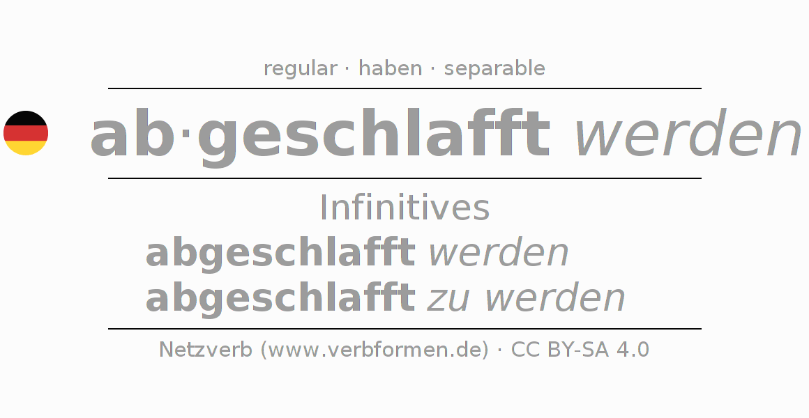 The conjugation of abschlaffen in Infinitive Present Perfect base form Passive is abgeschlafft werden, abgeschlafft zu werden.The conjugation corresponds to certain grammatical rules. Likewise the requirements for the conjugation of the simple verb forms of abschlaffen in Infinitive. Comments ☆