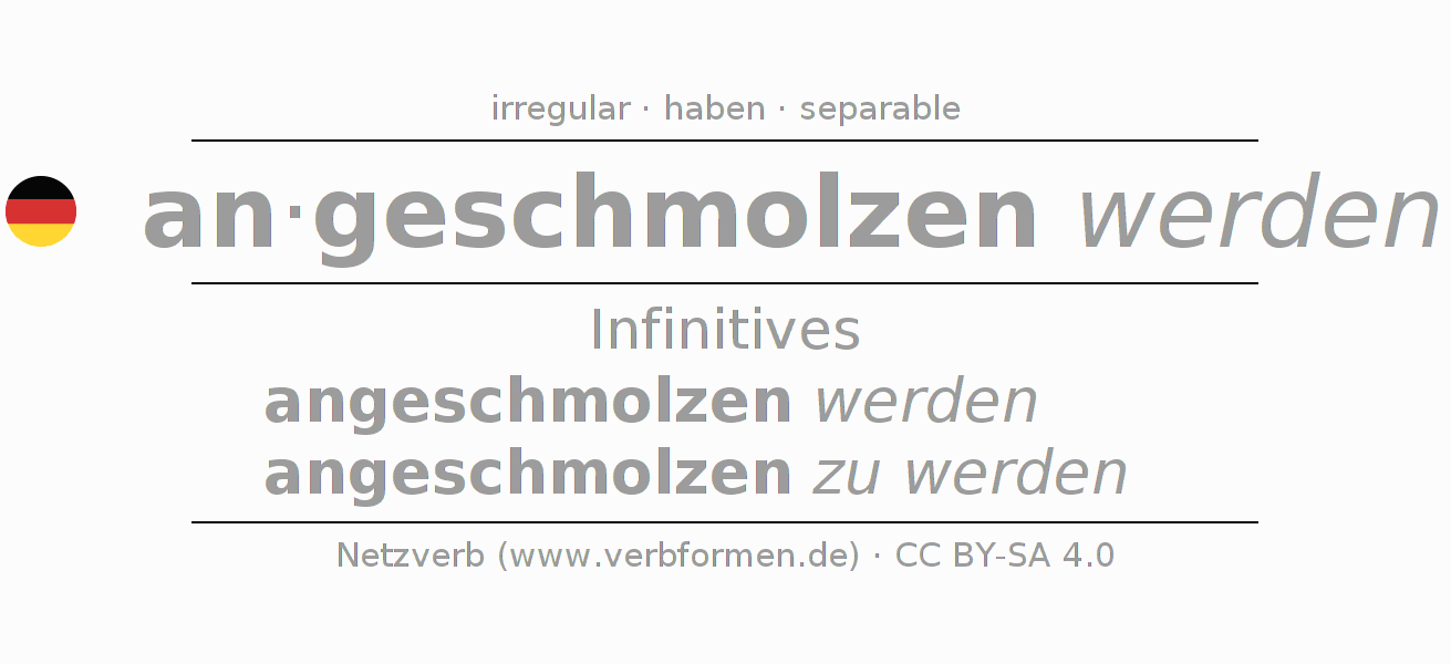 The conjugation of anschmelzen in Infinitive Present Perfect base form Passive is angeschmolzen werden, angeschmolzen zu werden.The conjugation corresponds to certain grammatical rules. Likewise the requirements for the conjugation of the simple verb forms of anschmelzen in Infinitive. Comments ☆