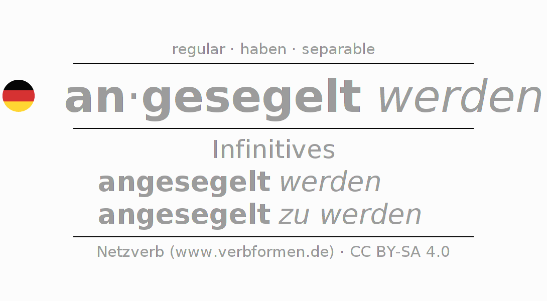 The conjugation of ansegeln in Infinitive Present Perfect base form Passive is angesegelt werden, angesegelt zu werden.The conjugation corresponds to certain grammatical rules. Likewise the requirements for the conjugation of the simple verb forms of ansegeln in Infinitive. Comments ☆