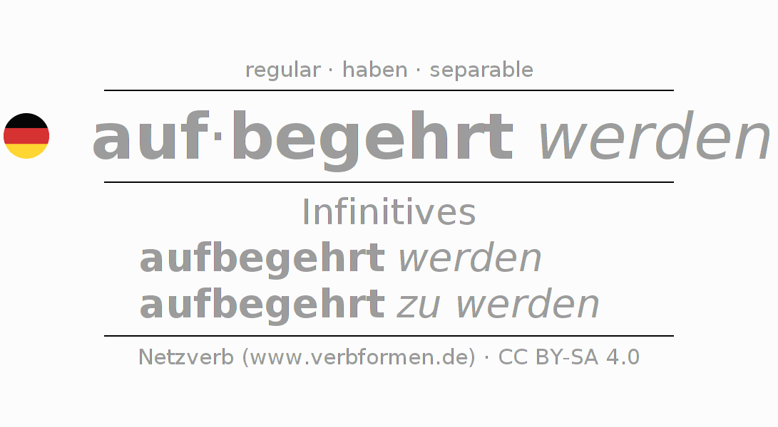 The conjugation of aufbegehren in Infinitive Present Perfect base form Passive is aufbegehrt werden, aufbegehrt zu werden.The conjugation corresponds to certain grammatical rules. Likewise the requirements for the conjugation of the simple verb forms of aufbegehren in Infinitive. Comments ☆