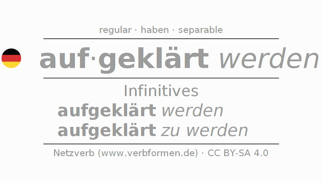 The conjugation of aufklären in Infinitive Present Perfect base form Passive is aufgeklärt werden, aufgeklärt zu werden.The conjugation corresponds to certain grammatical rules. Likewise the requirements for the conjugation of the simple verb forms of aufklären in Infinitive. Comments ☆