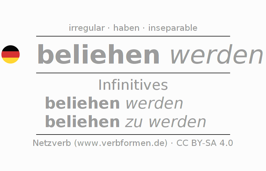The conjugation of beleihen in Infinitive Present Perfect base form Passive is belieh(e)n werden, belieh(e)n zu werden.The conjugation corresponds to certain grammatical rules. Likewise the requirements for the conjugation of the simple verb forms of beleihen in Infinitive. Comments ☆