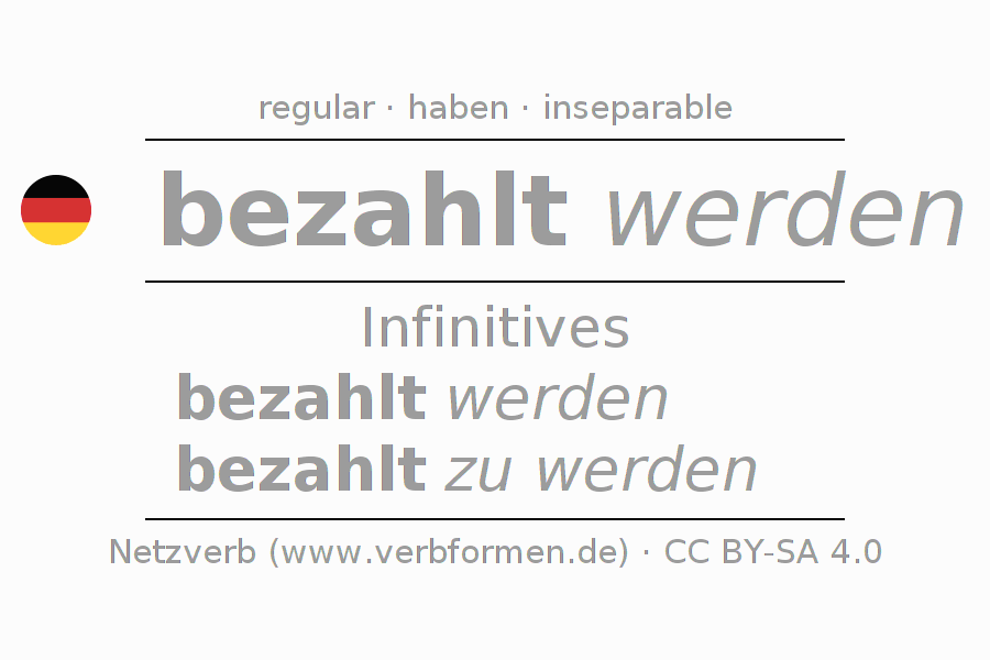 The conjugation of bezahlen in Infinitive Present Perfect base form Passive is bezahlt werden, bezahlt zu werden.The conjugation corresponds to certain grammatical rules. Likewise the requirements for the conjugation of the simple verb forms of bezahlen in Infinitive. Comments ☆