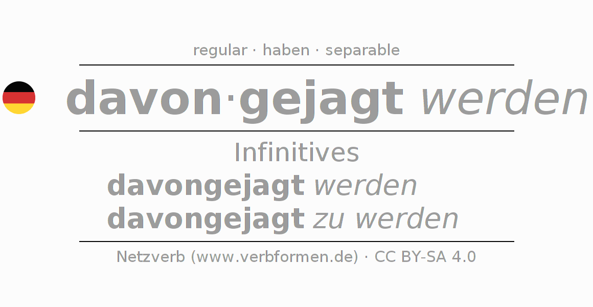 The conjugation of davonjagen in Infinitive Present Perfect base form Passive is davongejagt werden, davongejagt zu werden.The conjugation corresponds to certain grammatical rules. Likewise the requirements for the conjugation of the simple verb forms of davonjagen in Infinitive. Comments ☆