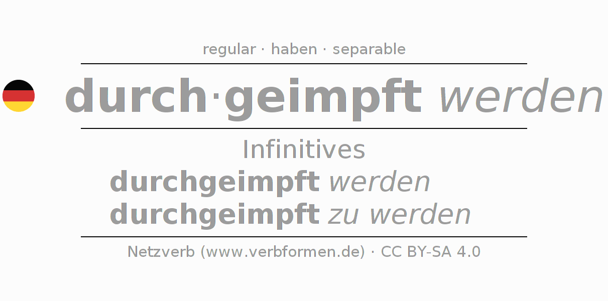 The conjugation of durchimpfen in Infinitive Present Perfect base form Passive is durchgeimpft werden, durchgeimpft zu werden.The conjugation corresponds to certain grammatical rules. Likewise the requirements for the conjugation of the simple verb forms of durchimpfen in Infinitive. Comments ☆