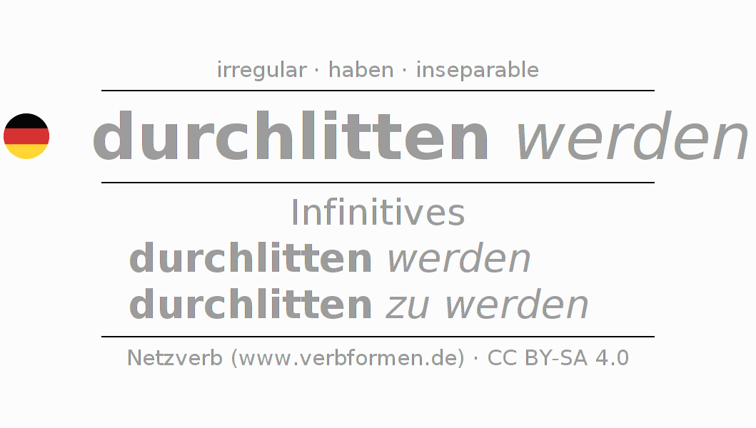 The conjugation of durchleiden in Infinitive Present Perfect base form Passive is durchlitten werden, durchlitten zu werden.The conjugation corresponds to certain grammatical rules. Likewise the requirements for the conjugation of the simple verb forms of durchleiden in Infinitive. Comments ☆