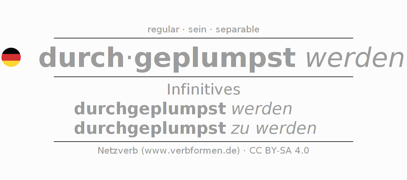 The conjugation of durchplumpsen in Infinitive Present Perfect base form Passive is durchgeplumpst werden, durchgeplumpst zu werden.The conjugation corresponds to certain grammatical rules. Likewise the requirements for the conjugation of the simple verb forms of durchplumpsen in Infinitive. Comments ☆