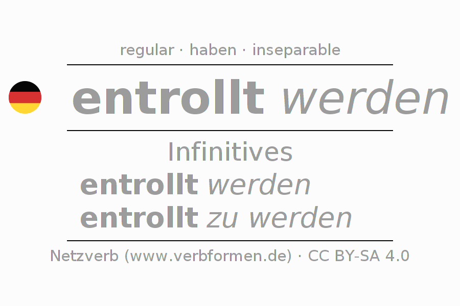 The conjugation of entrollen in Infinitive Present Perfect base form Passive is entrollt werden, entrollt zu werden.The conjugation corresponds to certain grammatical rules. Likewise the requirements for the conjugation of the simple verb forms of entrollen in Infinitive. Comments ☆